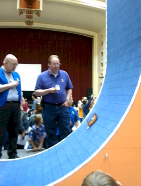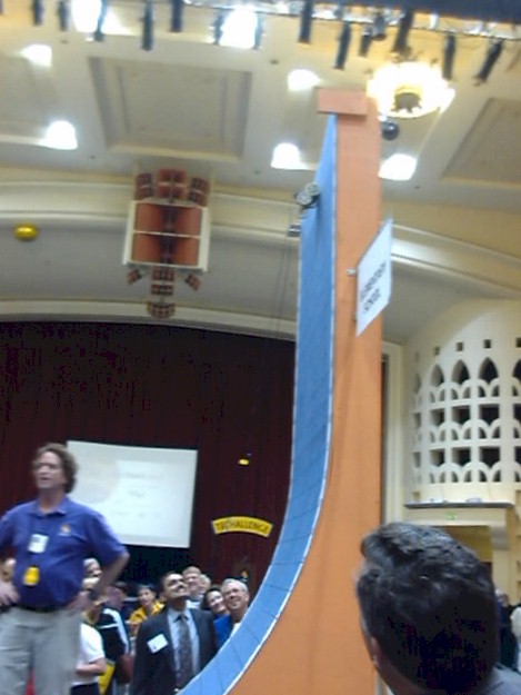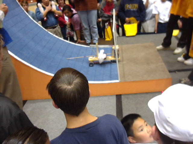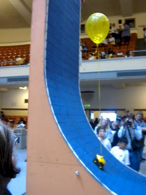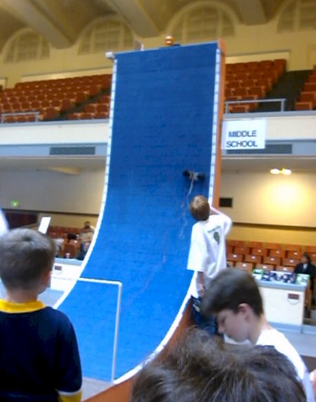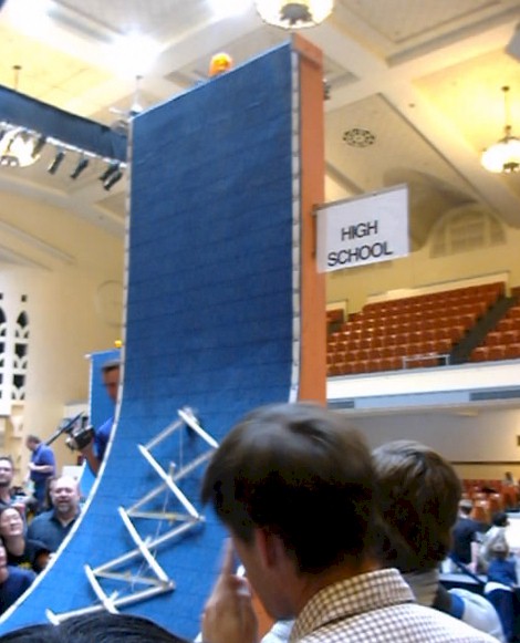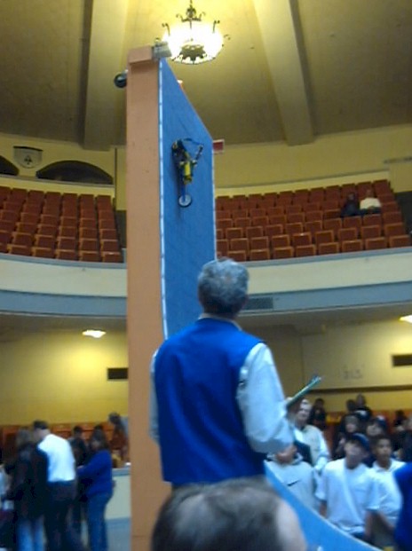 Here is another unit fouled by its power cord (seen hanging below). The device made it within 6 inches of the top, and then the ever-increasing weight of the cord caused the rear wheels to lift. This was an amazing equilibrium point, as the operator actually returned the car to this point several times, when the wheels would pop up. I don't understand the mechanics of how this happened, since the moment should pop the front wheels, but hey, that's what the tech challenge its all about! |