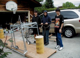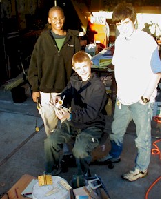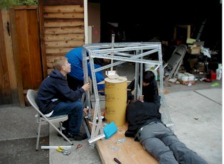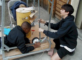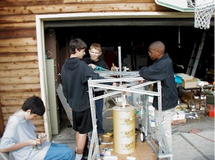 | Kenneth installs motor-driven wheels while Greg adds more internal supports. | |