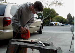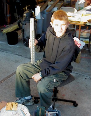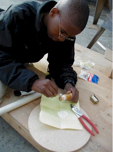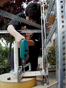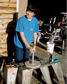 | Mike works on an end cap for the pedestal of the test track. This is the inverted cap placed on a cylinder that will receive the torch. | |