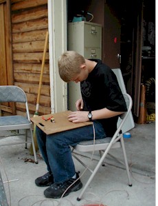 Ken epoxies a pointed end on the torch. The master plan for everything must be on the paper under the pliers. Click here to take a peek at the master plan... |