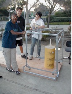 | The frame is taking shape - it needs drive motors. The cylinder in the center is holding the "torch", using the endcap from the above photo. | |
