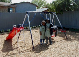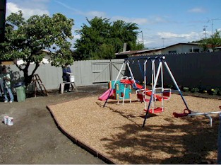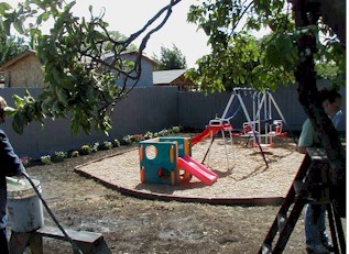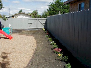 After: The backyard junk is removed, fences repaired and replaced, and a playground is built with a cheery row of flowers at the rear! | |
