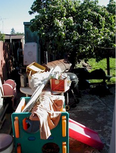 Before: Another view of the back yard - the shed to the rear is surrounded by stuff to be hauled away. | |