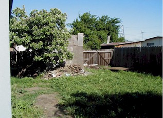 After: View looking to the left of the yard. Because of the ongoing health problems with the three sisters, we didn't install any high-maintenance landscaping, and stayed with color spots along the rear, where Jourdan and her friends would be playing. | |