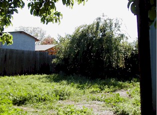 Before: This is the right side back yard. Beneath the canopy of leaves, there is a pile of scrap wood about 4 feet high and 8 feet wide. | |