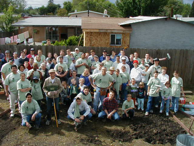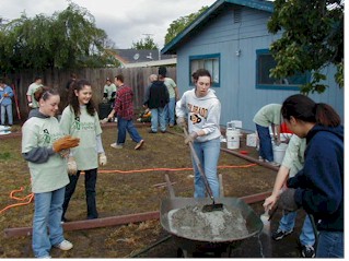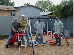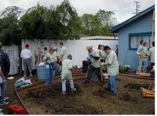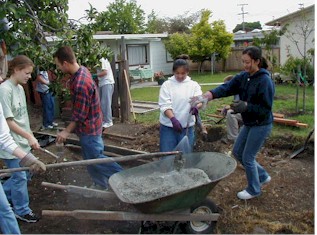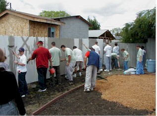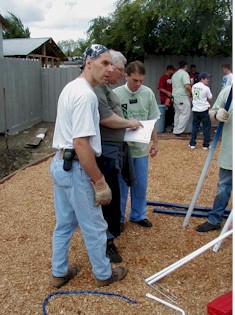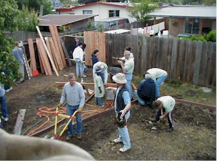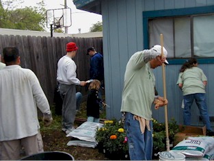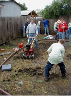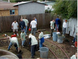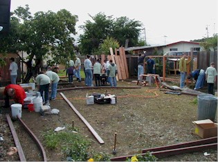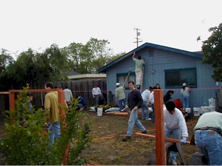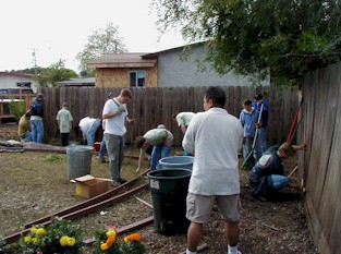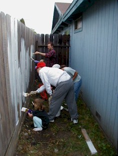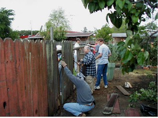 Side fence repair crew in action. The Weds prior, the vigorous youth group removed the burnt-out storage shed, along with a dumpster load of debris. We went through 3-4 20 yd dumpsters on the entire project. | |