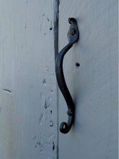 This is a closeup of the handle that Greg Osborn made for the gate, during lunch, using 1850s blacksmith techniques. This was actually forged from scratch out of a 1/2" round iron rod. | |