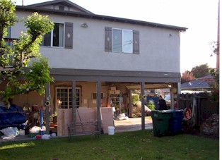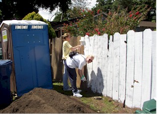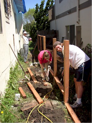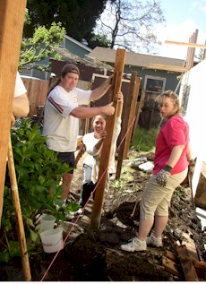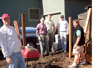 | Greg Osborn, master carpenter. You can tell the really talented carpenters - instead of placing the studs vertical and plumb, they place them according to they way they originally grew in the forest, sometimes leaning to the right, sometimes leaning to the left... | |