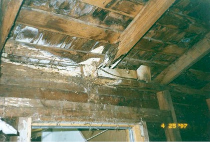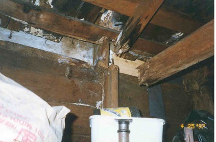 Here is another view above the doorway that was earlier concealed by furniture. A vestigal section of the top plate can be seen in the lower right side, but is soon lost, and the rafter tail is fully rotted. The ceiling joist for this rafter had falled down to the floor. |